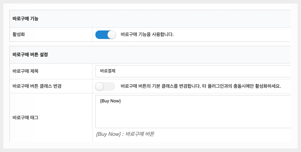 우리 쇼핑몰에 맞게 바로구매 기능의 네이밍을 자유롭게 만들어 이용 해 보세요.