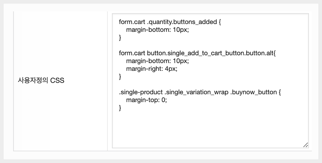 우커머스의 다양한 테마에 꼭 맞출수 있도록 커스텀 CSS 영역을 제공합니다.