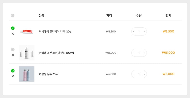 고객이 장바구니에 담은 상품을 선택 구입, 전체 구입할 수 있는 기능은 물론
