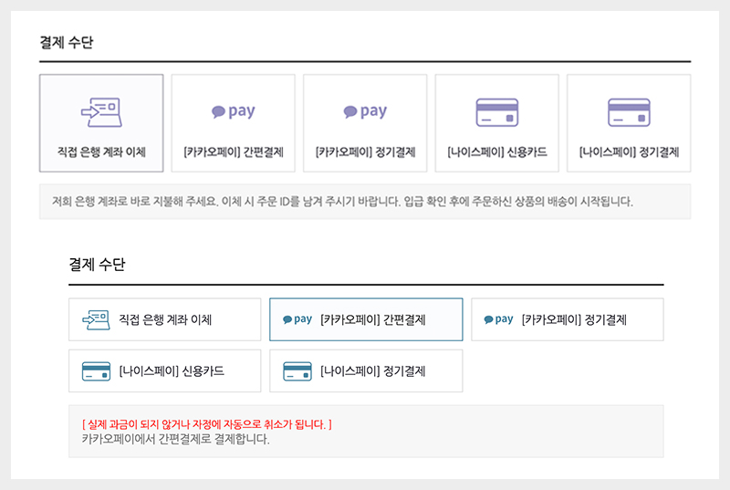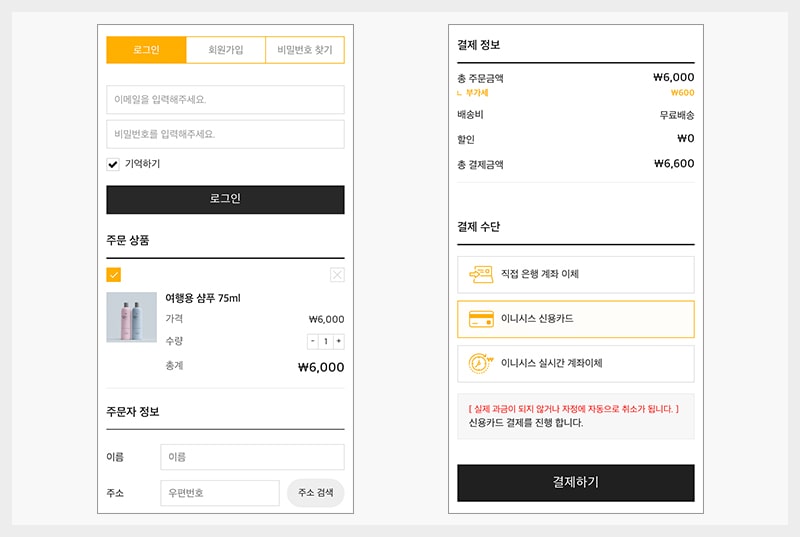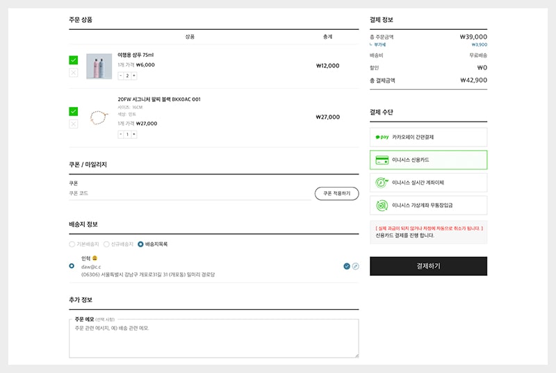 결제 페이지는 구매 확정을 이끌어 내는 마지막 페이지임과 동시에 우리 쇼핑몰에 마지막 인상을 제공하는 영역입니다.