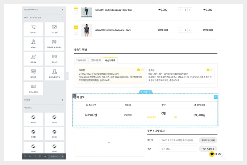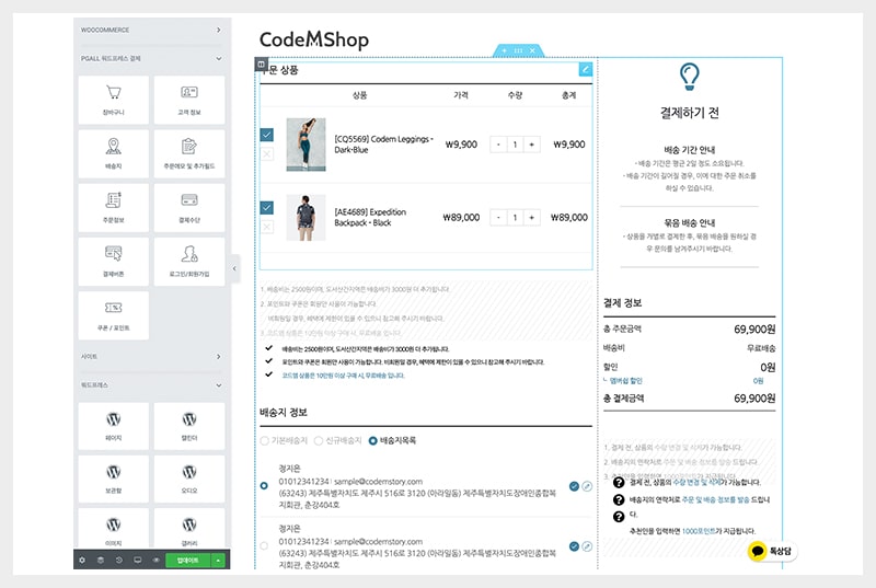 심플페이 DIY 체크아웃 플러그인은 장바구니에서 결제로 이어지는 모든 프로세스를 한 페이지로 제작할 수 있습니다.