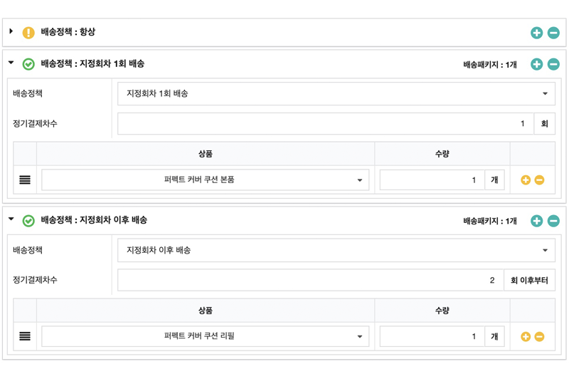 지정 회차에 따른 1회 배송, 지정회차 이후 배송, 갱신회차 반복 배송 등을 설정하여 운영할 수 있습니다.