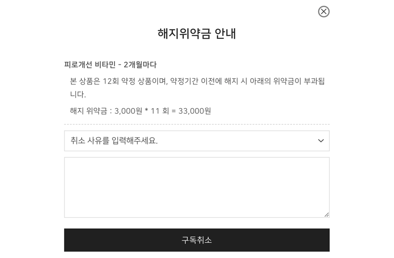 예) 상품 금액이 3,000원, 위약금 비율이 50%, 잔여 회차가 4회인 경우 6,000원(3,000원 * 50% * 4회)이 위약금으로 부과됩니다.