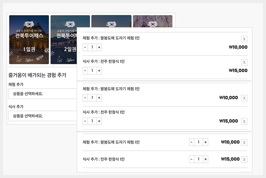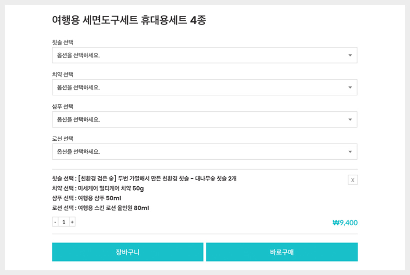 옵션을 하나씩 선택하여 장바구니에 담고 결제를 진행 해야만 합니다.