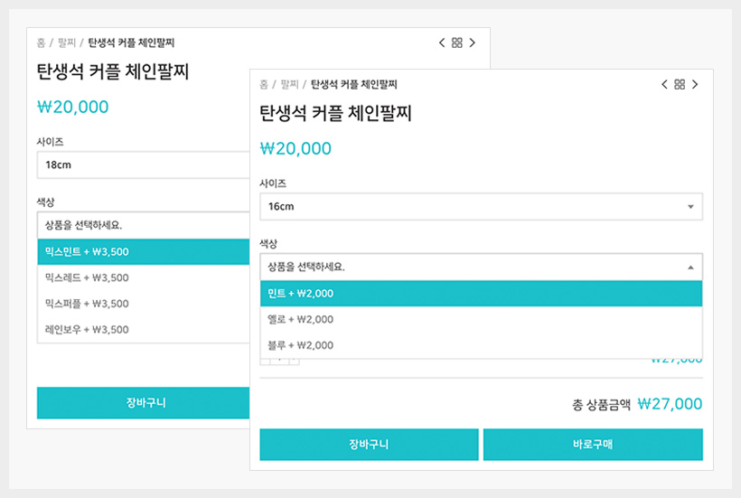 단일상품 구매 기능을 이용하여 옵션을 선택 시 현재 옵션보다 높은 가격은 + 로 낮은 가격은 – 로 나타낼수 있습니다.