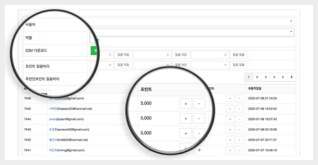 사용자, 역할별 필터링을 통해 포인트의 일괄 적립, 일괄 차감, 일괄 맞춤 처리 가능하며