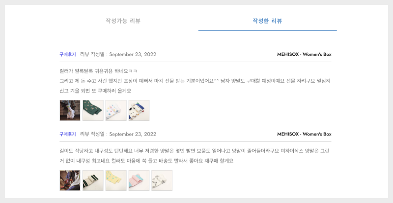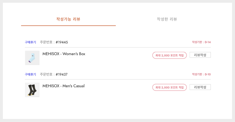 리뷰 페이지에서는 작성 가능한 리뷰와 작성한 리뷰를 확인 할 수 있으며,